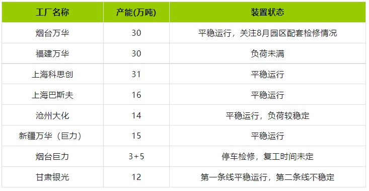 7月TDI市场高位盘整,整体偏强运行。第一周,TDI价格持续上涨,主因供应面受部分工厂检修、出口需求增加等影响,国内现货紧张,持货商心态看涨,TDI报盘不断上调;第二周,场内检修装置重启,下游对高价货源抵触,业者心态僵持,部分贸易商报盘下调,低价出货,TDI成交重心下移;后两周,受成本支撑,持货商低出意向减弱,TDI价格盘整运行。