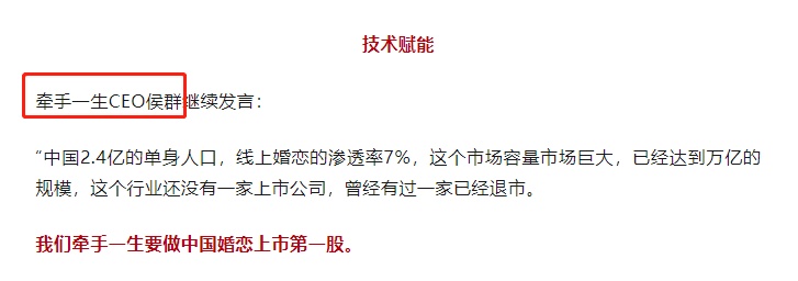 此外,另据新浪财经资料显示,牵手一生是深圳市牵约信息科技有限公司旗下的婚恋品牌,招股书中所披露的CEO侯群曾豪言要打造“中国婚恋上市第一股”。而深圳抢我娱乐科技有限公司持有深圳市牵约信息科技有限公司90%的股权,同时持有深圳市元族世纪网络科技有限公司99%的股权。