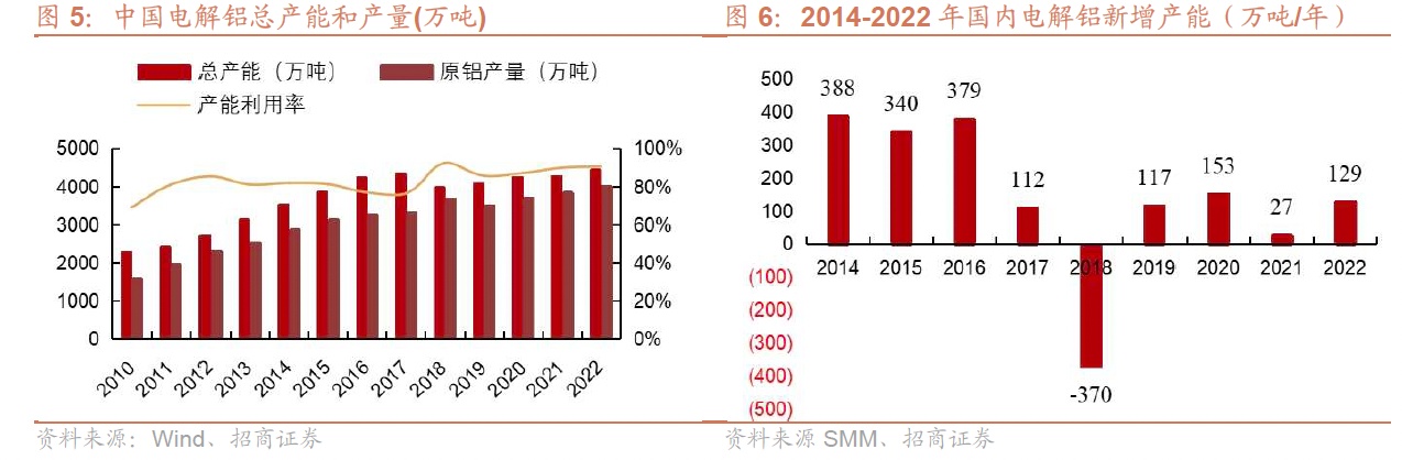 回溯历史,过去20余年来,全球电解铝增量基本来源于中国,尤其是近五年来中国电解铝增量贡献全球增量的90%以上。但由于铝是高耗能金属,碳排放量较大,因此近年来我国已经在严控新增产能,严格落实产能置换。
