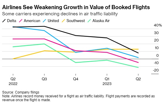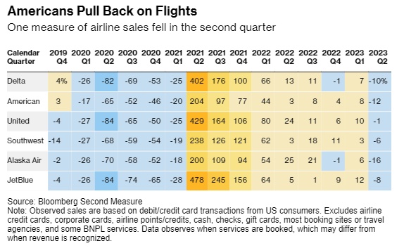 Bloomberg Second Measure的数据显示,第二季度美国消费者直接从国内主要航空公司订的机票数量出现全面下降,这是两年多来的首次下降。不过,这些数据并不是全貌。该机构跟踪与运营商进行的匿名信用卡和借记卡交易,但不包括预订网站和企业销售。