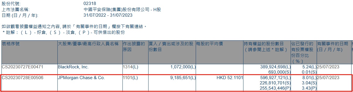 智通财经APP获悉,香港联交所最新资料显示,7月25日,小摩增持中国平安(02318)918.5651万股,每股作价52.1101港元,总金额约为4.79亿港元。增持后最新持股数目约为5.97亿股,最新持股比例为8.01%。