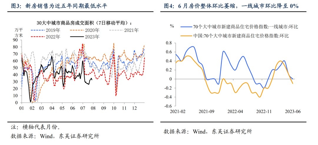 很可能是的。从整体上看,“我国房地产市场供求关系发生重大变化”集中表现在地产销售的量价齐跌,这说明当前地产需求的疲软要更甚于行业去杠杆带来的供给收缩:下半年以来,地产需求端延续低迷,30城口径商品房成交面积是近五年以来的最低同期水平,其中二、三线城市拖累较大;而作为经济信心重要“温度计”的房价则继续边际转弱,6月70城新房房价环比整体转负,其中一线城市也降温至0%。