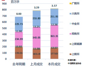 郑商所月成交量为363.31百万手,占全国市场的44.23%,同比增长54.61%,环比增长5.91%。
