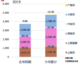 上期能源月累计成交量为73.20百万手,占全国市场的1.53%,同比增长5.31%。
