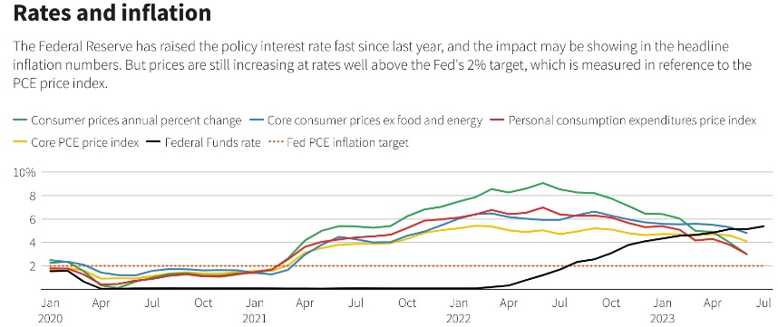 尽管美国总体通胀率已从2022年的高点大幅回落,但衡量潜在价格压力的指标变化较为缓慢。剔除食品和能源成本的核心个人消费支出(PCE)价格指数在连续几个月维持在接近4.6%后,6月份同比明显放缓至4.1%,但仍是2%目标的两倍多。