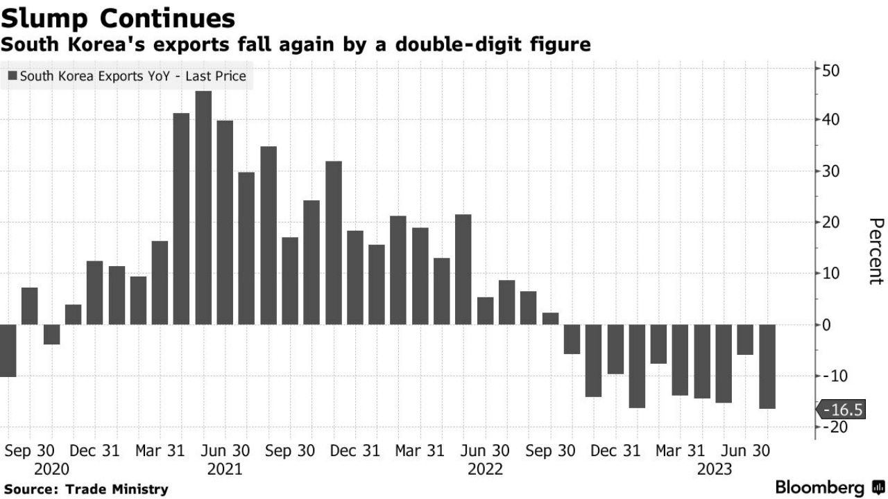 特别是,韩国的半导体出口下滑了34%,石油产品出口大幅下降了42%。不过,汽车出口增长了15%。韩国是全球最大的出口国之一,出口的各种商品使其数据成为国际贸易趋势的晴雨表。目前,全球经济活动受到高通胀、上升的利率的影响。