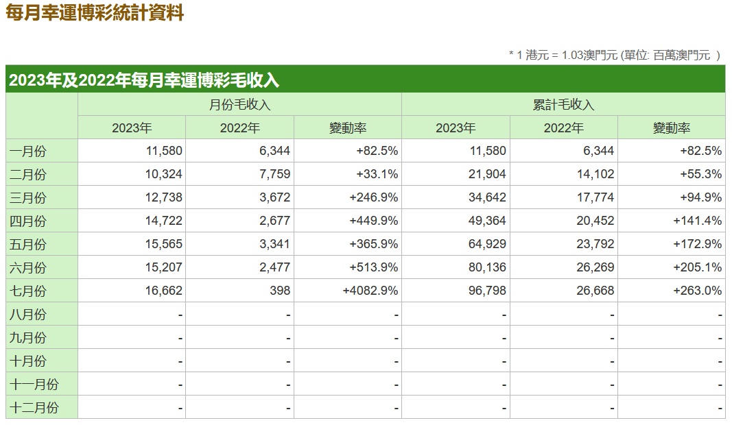智通财经APP获悉,8月1日,澳门博彩监察协调局发布7月份博彩收入数据。数据显示,澳门7月份幸运博彩毛收入166.62亿澳门元,同比上升4082.9%;澳门1-7月份幸运博彩累计毛收入967.98亿澳门元,同比上升263%。