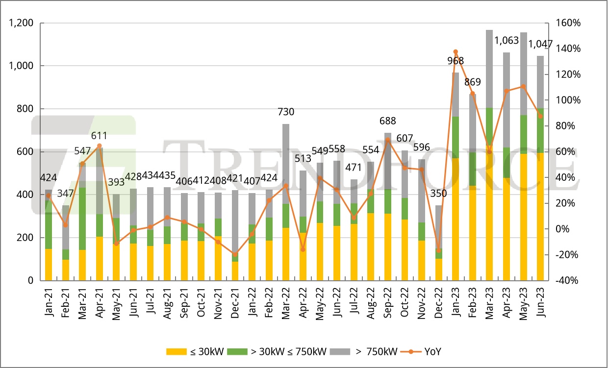 2023年1-6月德国光伏新增装机6.27GW,同比增长97%,其中6月德国光伏新增装机1.05GW,同比增长87.5%,环比下降9.4%。受免税政策推动,德国30kW及以下的户外光伏装机量迅速增长。2023年6月,BMWK发布《光伏战略》中的SolarPackageI草案,800kW容量以下的阳台光伏无需审批,阳台光伏装机有望迎来爆发式增长。