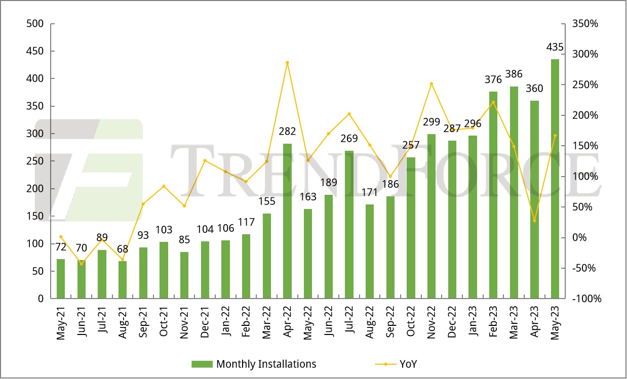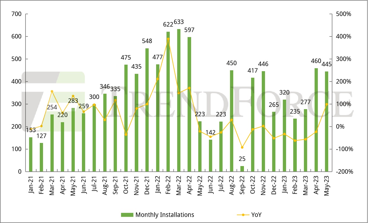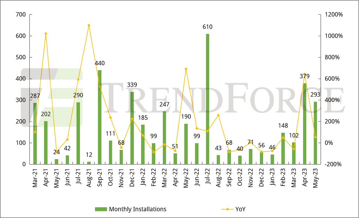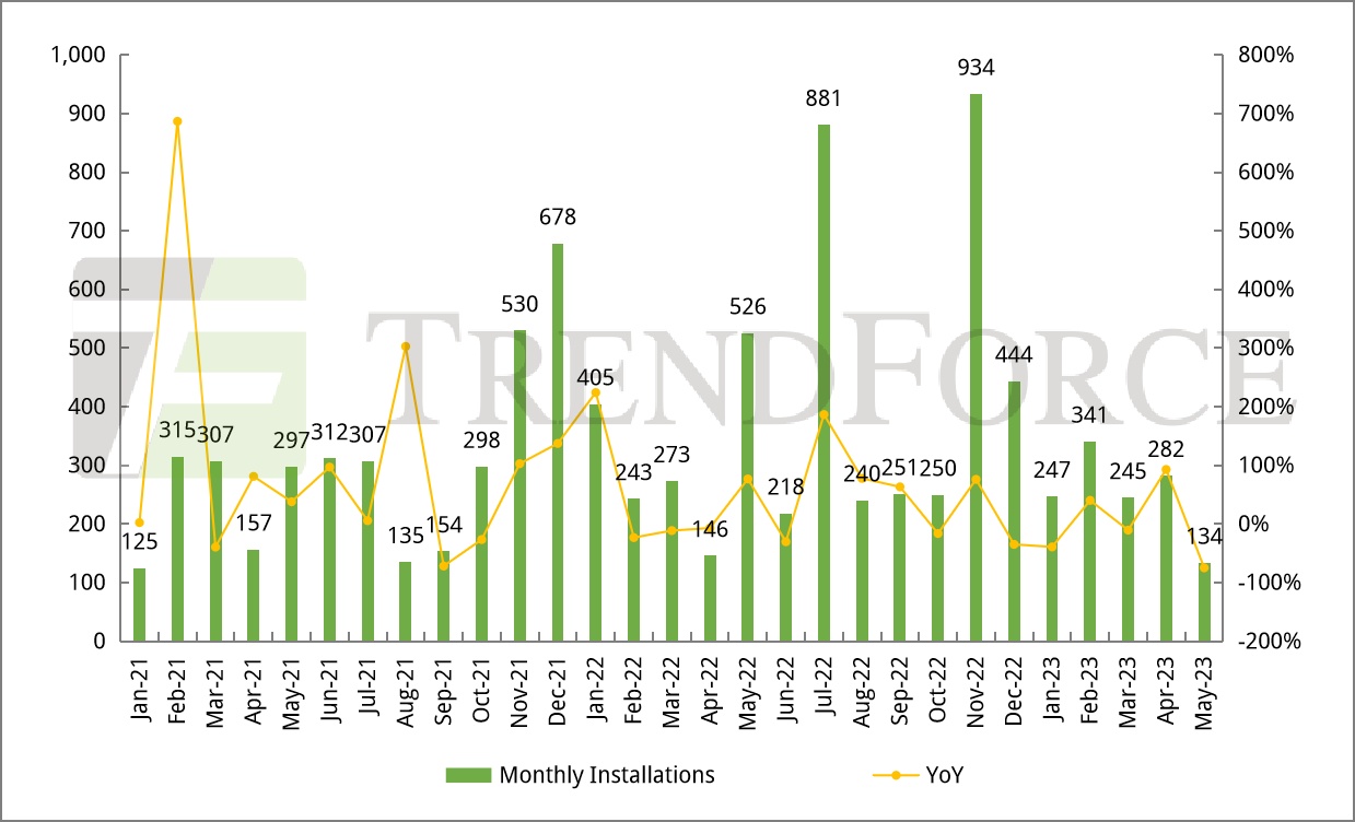 2023年1-5月波兰光伏新增装机量达1.74GW,同比下降32%,其中,5月波兰光伏新增装机445MW,同比增长99.2%,环比下降3.2%。波兰光伏装机以户用分布式微网为主,然高通膨导致贷款成本增加叠加净计费政策推出,微型光伏装机或将有所放缓。此外,波兰过往的招标项目将在2023年陆续并网叠加PPA需求旺盛,预计2023年地面光伏装机量将有序增长。