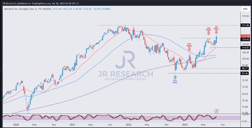 因此,上周的突破得到了维持,这表明谷歌在7月份的底部应该会为其继续复苏并重新获得2022年初的高点(150美元区域)提供关键支撑。