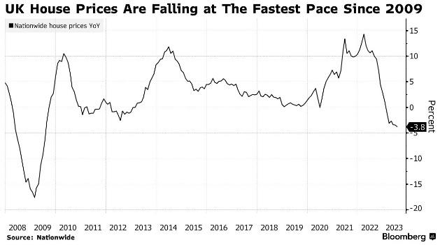 英国全国房屋抵押贷款协会(Nationwide Building Society)表示,房屋价格较上年同期下跌3.8%,为2009年以来最大跌幅,且快于上月3.5%的跌幅。经济学家此前预计的降幅将扩大至4%。