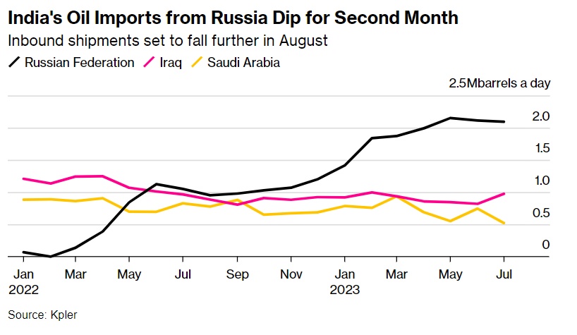智通财经APP获悉,印度从俄罗斯进口的原油连续两个月下降,分析人士预计从俄罗斯的进口量在8月份将进一步下滑,因为欧佩克+主要产油国8月份开始削减原油出口,以帮助平衡全球原油市场。