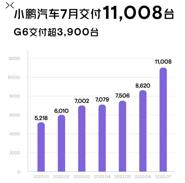 智通财经APP获悉,8月1日,小鹏汽车(09868)官微发布消息称,2023年7月共交付新车11008台,环比增长28%,连续六个月实现正增长,重新迈入万辆交付新里程。小鹏G6实现上市即交付,从7月中至7月底,G6已在全国110座城市启动规模交付,7月累计交付超3900台。