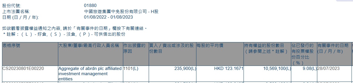 智通财经APP获悉,香港联交所最新资料显示,7月28日,Aggregate of abrdn plc affiliated investment management entities增持中国中免(01880)23.59万股,每股作价123.1671港元,总金额约为2905.51万港元。增持后最新持股数目为1056.91万股,最新持股比例为9.08%。