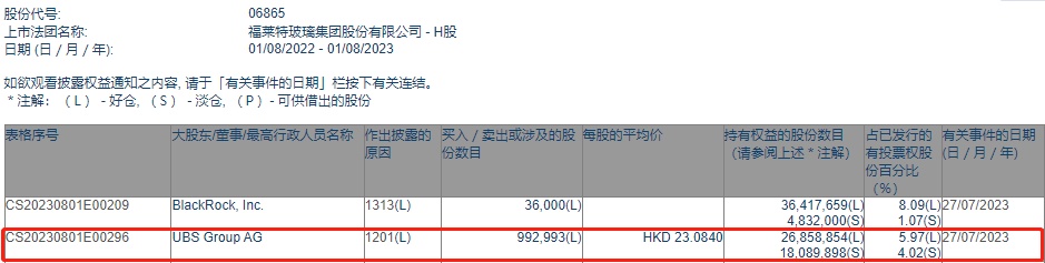 智通财经APP获悉,香港联交所最新资料显示,7月27日,UBS Group AG减持福莱特玻璃(06865)99.2993万股,每股作价23.0840港元,总金额约为2292.23万港元。减持后最新持股数目约为2685.89万股,最新持股比例为5.97%。