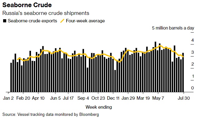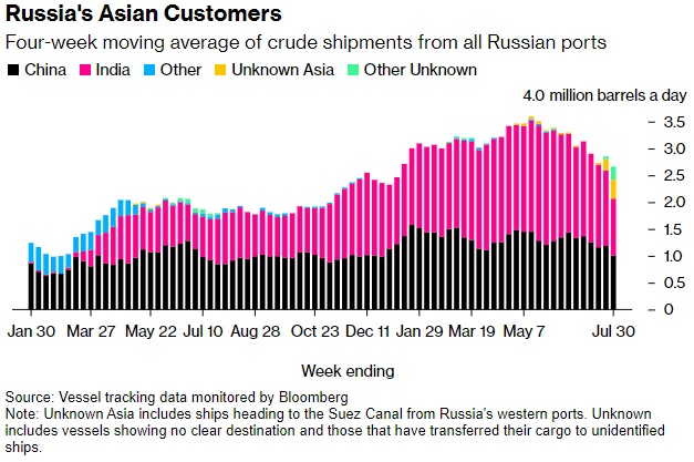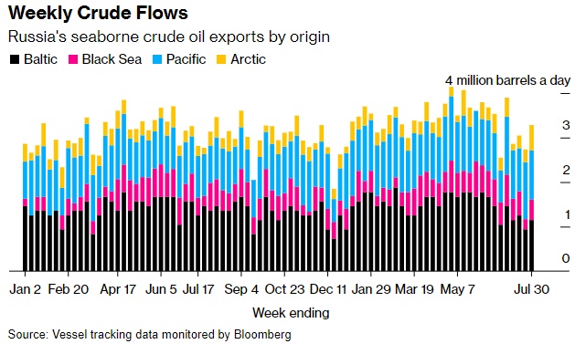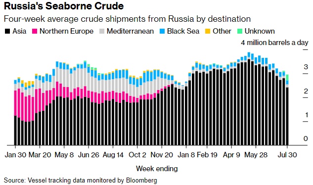 在截至7月30日的四周内,俄罗斯亚洲客户的平均出口量,加上没有最终目的地的船只,从截至7月23日的四周内修正后的每天285万桶降至每天266万桶。这使得亚洲买家的每周和四周平均资金流均降至1月份以来的最低水平。