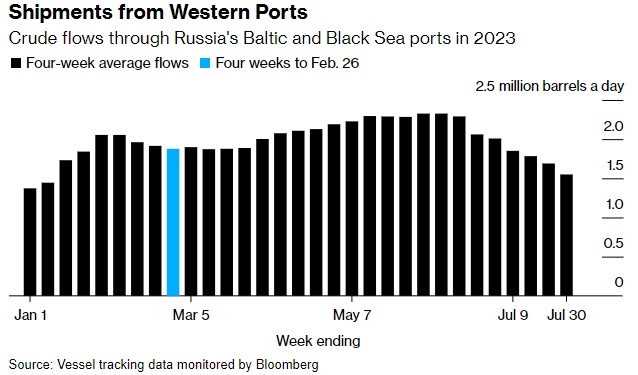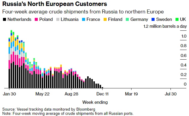从波罗的海、黑海和北极的出口码头,每天消耗约150万桶短途海运原油的市场已经几乎完全消失,取而代之的是亚洲的长途目的地,后者的运输成本和时间都要高得多。