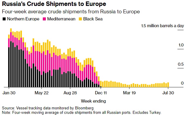 在截至7月30日的四周内,没有俄罗斯原油运往北欧国家。