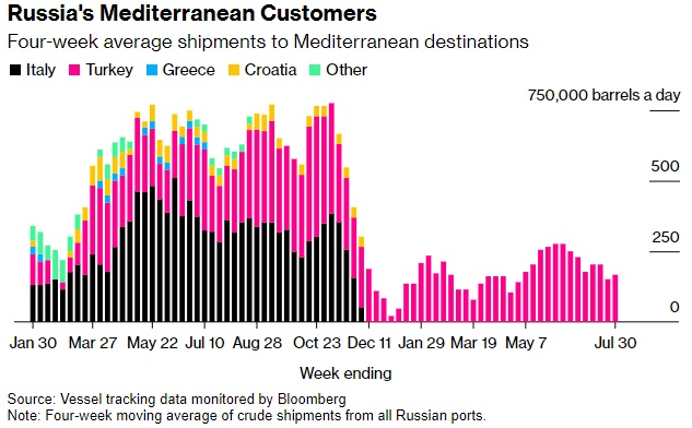 在截至7月30日的四周内,俄罗斯对土耳其的出口量小幅上升至16.7万桶/日。土耳其是俄罗斯仅存的地中海客户。去年10月,流入该国的石油日产量曾超过42.5万桶。