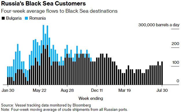 保加利亚目前是俄罗斯在黑海唯一的原油市场,该国的原油流量恢复至12.5万桶/日,相当于今年1月以来的最高水平。