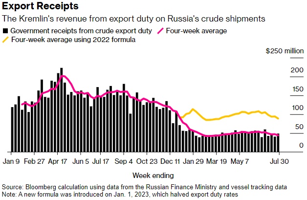 在截至7月30日的七天内,俄罗斯原油出口关税资金增至4900万美元,增幅为800万美元,增幅为20%。四周平均收入下降到略高于4400万美元,截至7月2日的那一周的最高收入从计算中剔除。