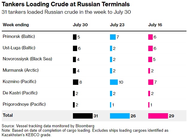 船舶跟踪数据和港口代理报告显示,在截至7月30日的一周内,共有31艘油轮装载了2297万桶俄罗斯原油。这比前一周的数字增加了383万桶,是四周以来最多的。