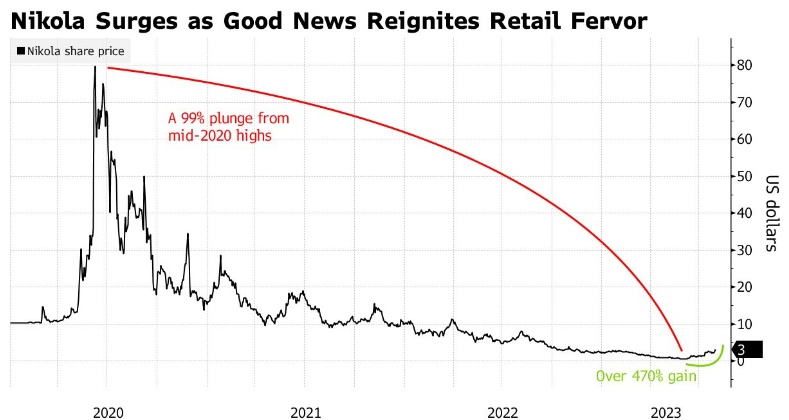 智通财经APP获悉,近日来,电动汽车初创公司Nikola(NKLA.US)股价的反弹势头丝毫没有停止的迹象,该公司保存现金和获取资金的最新举措重新点燃了投资者对其股票的热情。在一系列利好消息的推动下,这家电动汽车制造商的股价在短短三个交易日内上涨了近50%。该公司曾被视为行业巨头特斯拉(TSLA.US)的潜在竞争者。Vanda Research数据显示,过去两个月该股从底部反弹了476%,其中很大一部分是由散户投资者的复苏所推动的。在此期间,尼古拉在推特和Stocktwits.com等社交媒体平台上被大量搜索。