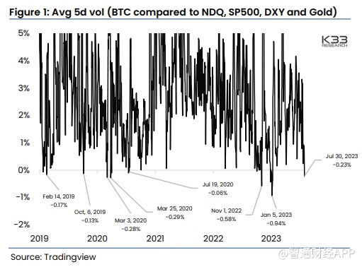 事实上,比特币的30天波动率接近5年低点,这种情况自2019年1月以来仅出现过8次。