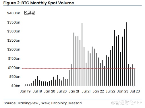 许多市场观察人士一直在谨慎地跟踪交易量,因为在2022年的一系列丑闻和公司倒闭后,大量投资者逃离了加密货币市场。此外,根据K33的说法,交易量下跌的“很大一部分”可归因于币安交易所重新引入交易费。