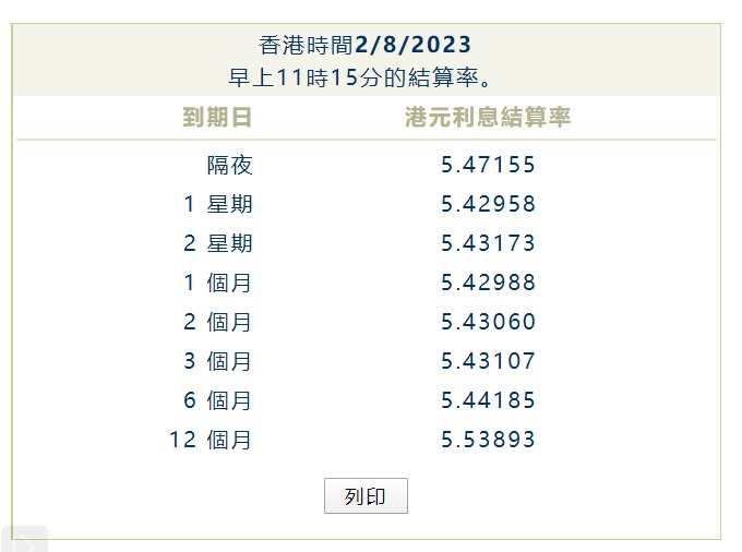 APP获悉,香港银行公会数据显示,8月2日,港元拆息全线上扬。隔夜息回升至5.47155%,而与楼按相关的一个月拆息连升六天报5.42988%,高见5.42988%,与同期美元LIBOR接近平水。三个月拆息亦升至5.43107%,与同期美元LIBOR息差收窄至20基点。长息方面,六个月拆息升至5.44185%,一年期报5.53893%。