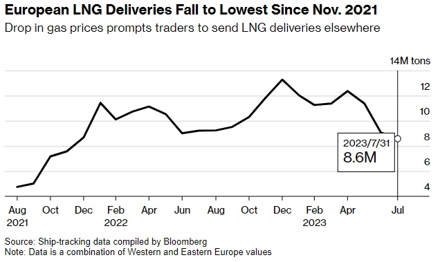 欧洲的液化天然气进口量在2022年飙升了60%以上,以弥补入俄罗斯管道天然气输送的损失。该地区目前的库存高于平均水平,且面临需求低迷,但在为冬季做准备之际,可能需要提高价格,从亚洲竞争对手那里争夺货物。