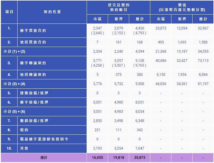 智通财经APP获悉,8月2日,香港土地注册处公布,7月送交该处注册的所有种类楼宇买卖合约共4426份,环比跌7.3%,同比跌11.4%;楼宇买卖合约总值330亿元,环比跌16.9%,同比跌21.4%。上述买卖合约中,住宅楼宇买卖合约占3065份,环比跌15.2%,同比跌16.5%;住宅楼宇买卖合约总值266亿元,环比跌20.9%,同比跌21.5%。以12个月移动平均数计算,7月的楼宇买卖合约为5087份,环比下调0.9%,同比下调17.1%。