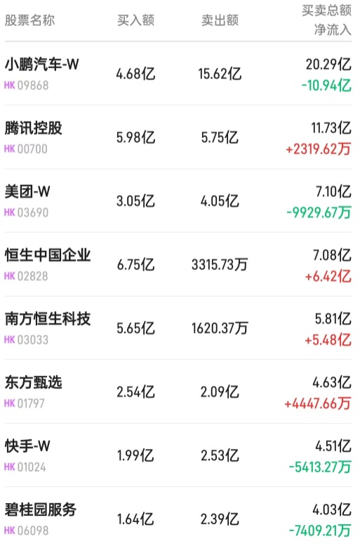 北水净买入最多的个股是恒生中国企业(02828)、南方恒生科技(03033)、东方甄选(01797)。北水净卖出最多的个股是小鹏汽车-W(09868)、腾讯(00700)、汇丰控股(00005)。