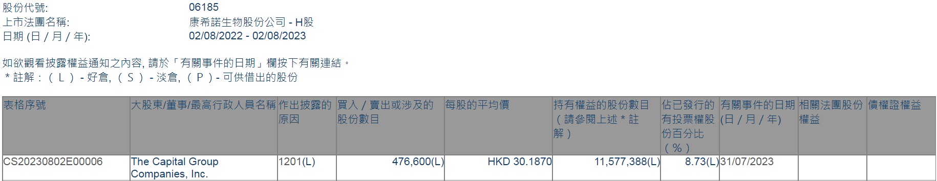 智通财经APP获悉,香港联交所最新资料显示,7月31日,美国资本集团减持康希诺生物(06185)47.66万股,每股作价30.1870港元,总金额约为1438.71万港元。减持后最新持股数目约为1157.74万股,最新持股比例为8.73%。