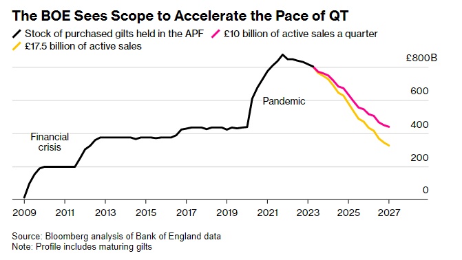 凯投宏观和法国巴黎银行等机构的分析师表示,官员们最早可能会在周四表示,他们将开始以更快的速度缩减资产负债表。目前,英国央行停止了对其到期国债的再投资,并自去年9月以来一直在积极出售债券,目标是每年减少800亿英镑的投资组合。