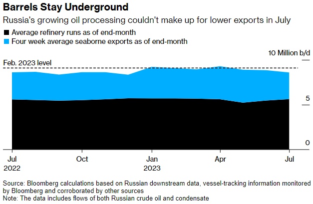 7月,运往俄罗斯炼油厂的原油数量有所增加,但海运出口降幅更大。最终的结果是,这两笔关键交易的日总成交量略低于860万桶。