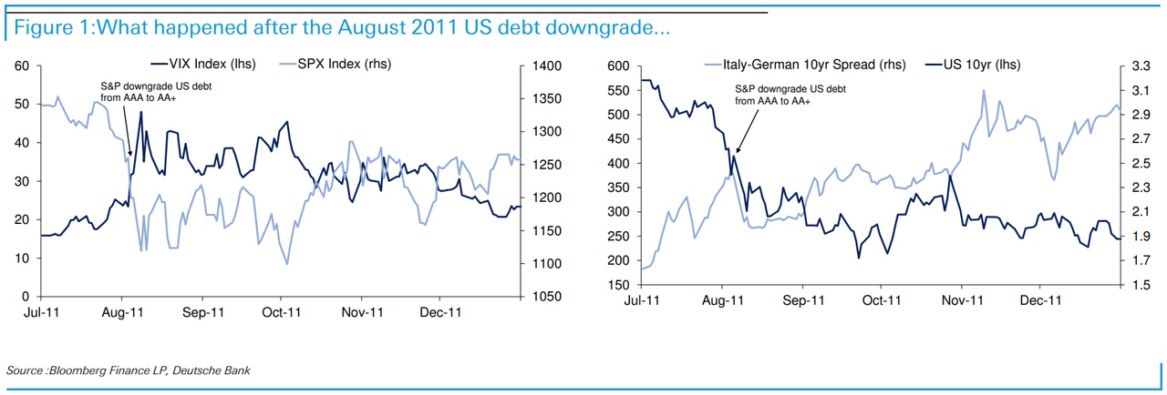 德意志银行策略师Jim Reid写道,这些图表“显示了2011年8月5日前后发生的事情,当时标普全球做出了同样的降级决定,这一决定也是在紧张的债务上限谈判之后做出的(尽管谈判在降级前几天才成功结束)。鉴于距离降级的时间很近,并且激烈的谈判仍在持续,7月份市场情绪疲弱”。