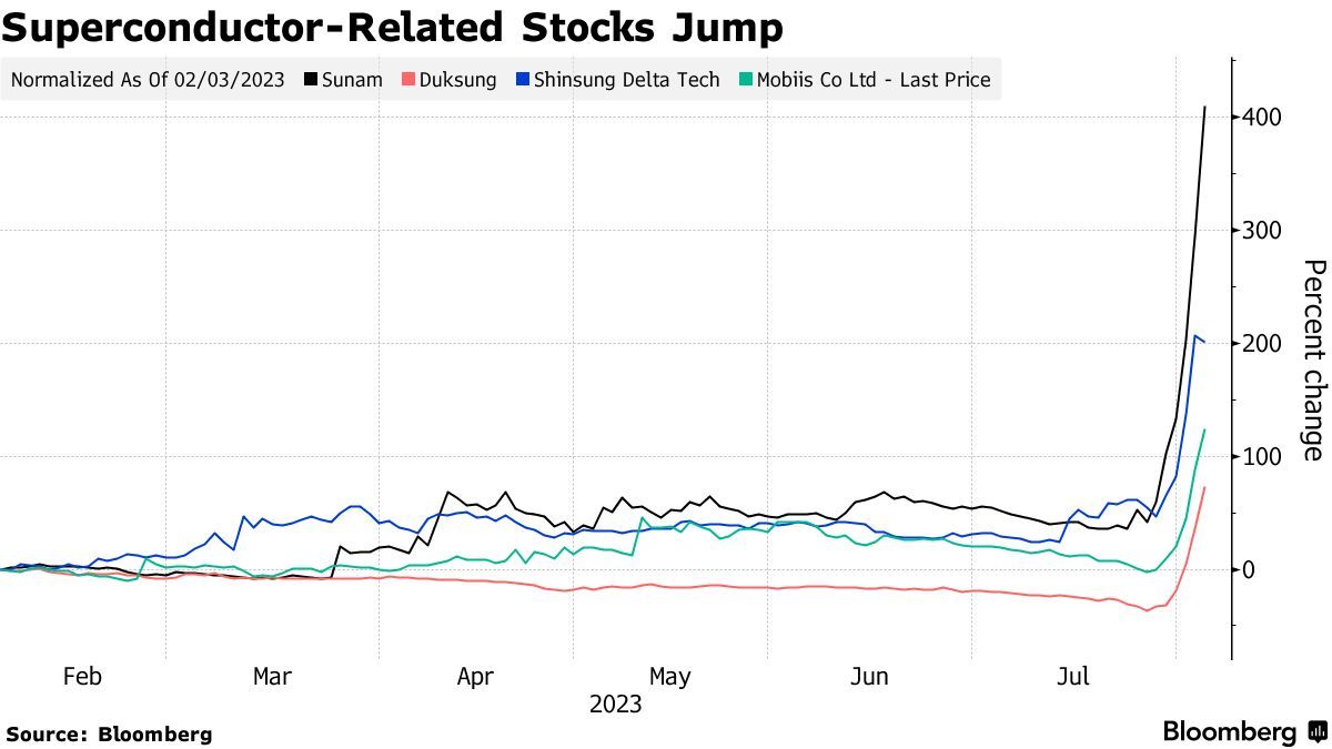 自7月22日韩国研究人员发布报告称合成了全球首个室温超导材料——“改性铅磷灰石晶体结构(LK-99)”以来,被视为与超导技术相关的股票一直在上涨。不过,Kiwoom证券公司的分析师Han Jiyoung警告称:“投资者应该对这些超导主题股票的波动性增加持谨慎态度,因为它们的实质并不清楚。”