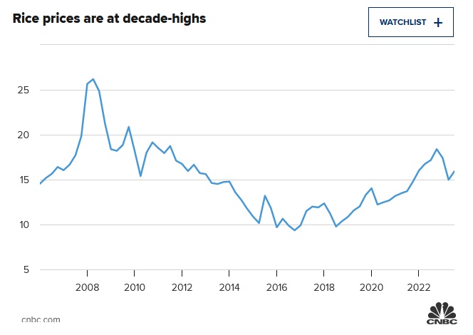 全球大米价格目前徘徊在十年来的高点,部分原因是供应紧张。在俄乌冲突之后,由于其他主要谷物的价格飙升,大米成为了一种有吸引力的替代品。