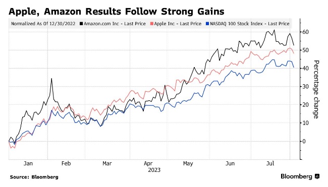 周三,在惠誉下调美国主权债务评级后,美国国债收益率飙升,对利率敏感的科技股则遭受冲击。今年以来,科技股推动的上涨已使标普500指数的市值增加了逾6万亿美元,尽管Alphabet(GOOGL.US)和Meta(META.US)公布的业绩好于预期,但科技板块在距离纳斯达克100指数历史高点不到5%的范围内一直举步维艰。