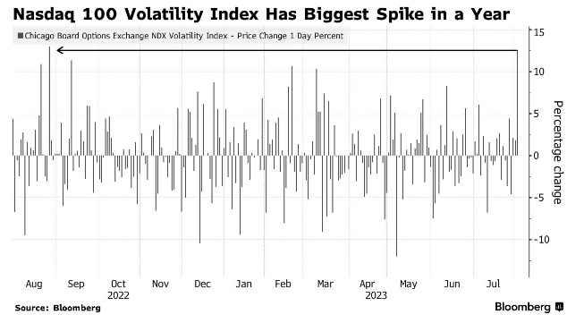 CBOE纳斯达克100波动率指数周三上涨12.5%,创下近一年来最大单日百分比涨幅。波动性飙升之际,纳斯达克100指数大幅下跌2.2%。