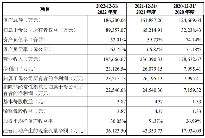 财务方面,2020年度、2021年度和2022年,宏石激光营业收入分别约为17.87亿元、23.64亿元和19.57亿元;同期,归属于母公司所有者的净利润分别为7995.41万元、2.62亿元和2.32亿元。