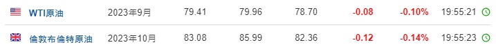 3. 截至发稿,WTI原油跌0.10%,报79.41美元/桶。布伦特原油跌0.14%,报83.08美元/桶。