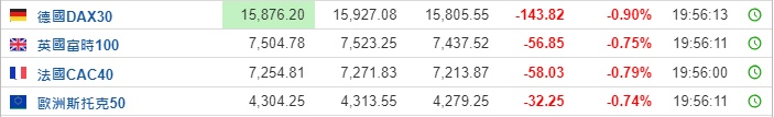2. 截至发稿,德国DAX指数跌0.90%,英国富时100指数跌0.75%,法国CAC40指数跌0.79%,欧洲斯托克50指数跌0.74%。