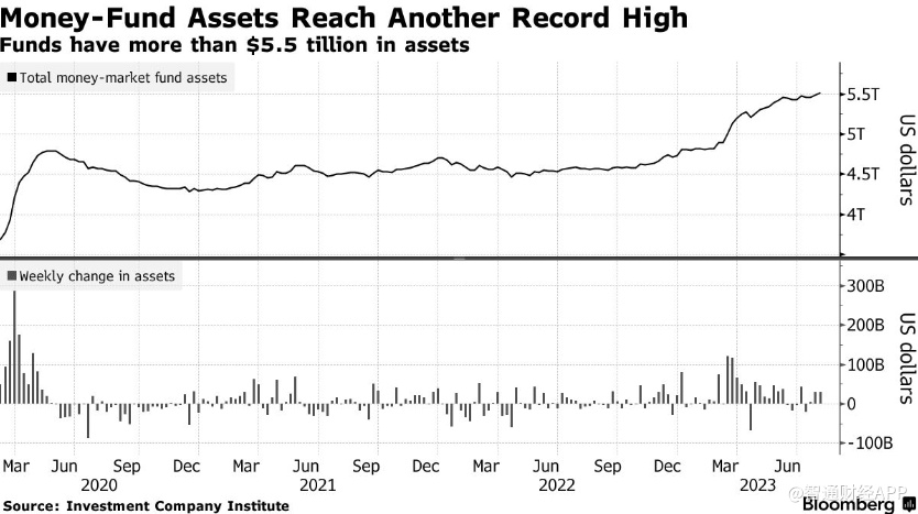 智通财经APP获悉,由于5%以上的利率吸引了银行和其他短期投资的资金,美国货币市场基金资产规模攀升至新高。据美国投资公司协会的数据,截至8月2日的一周,约有290亿美元流入美国货币市场基金,总资产达到5.52万亿美元,前一周为5.49万亿美元。