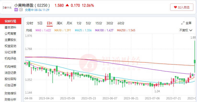 二级市场方面,小黄鸭德盈股价自7月初以来,持续反弹,8月4日盘中最高达1.88港元/股,创去年年底以来的阶段性新高。