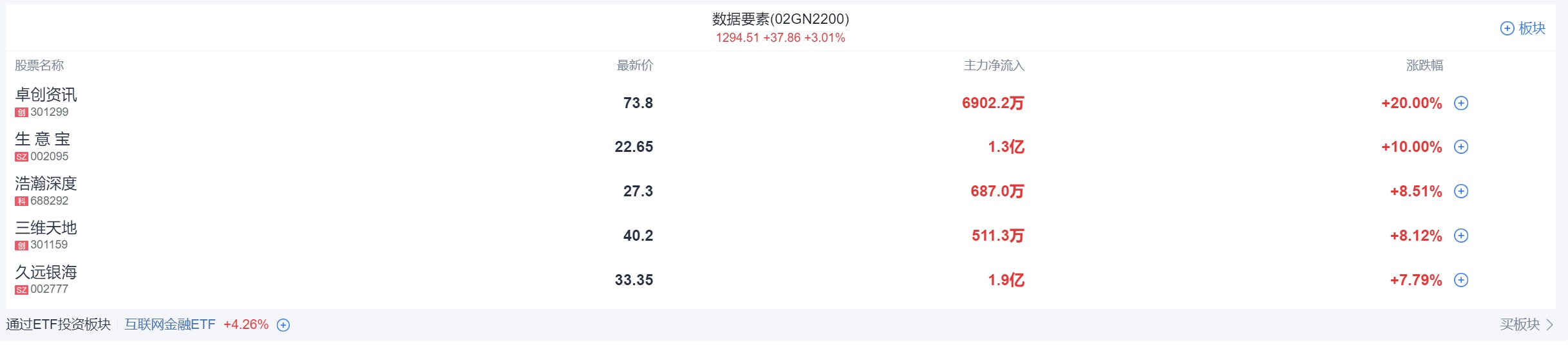 数据要素概念股午后继续走强,卓创资讯、久远银海双双涨停,人民网、上海钢联、三维天地、深桑达A、太极股份等纷纷走高。