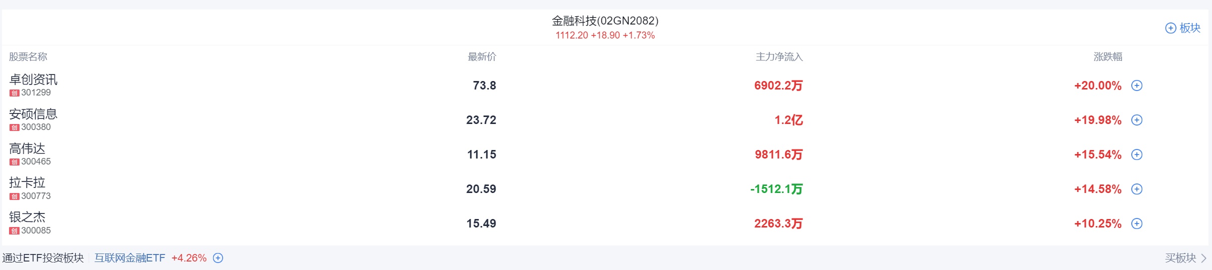午后金融科技板块持续走高,金证股份封板,指南针20CM涨停并创出历史新高,高伟达、银之杰、科蓝软件涨超10%,大智慧、财富趋势涨幅靠前。