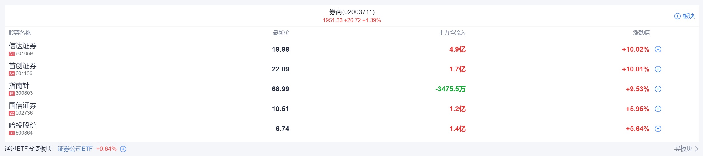 券商等大金融板块爆发,安硕信息20%涨停,首创证券2连板,太平洋、华创云信、哈投股份、信达证券多股涨停。