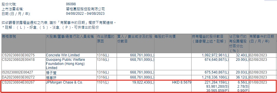 智通财经APP获悉,香港联交所最新资料显示,8月1日,小摩增持碧桂园服务(06098)1902.2430万股,每股作价8.5679港元,总金额约为1.63亿港元。增持后最新持股数目约为2.21亿股,最新持股比例为6.56%。
